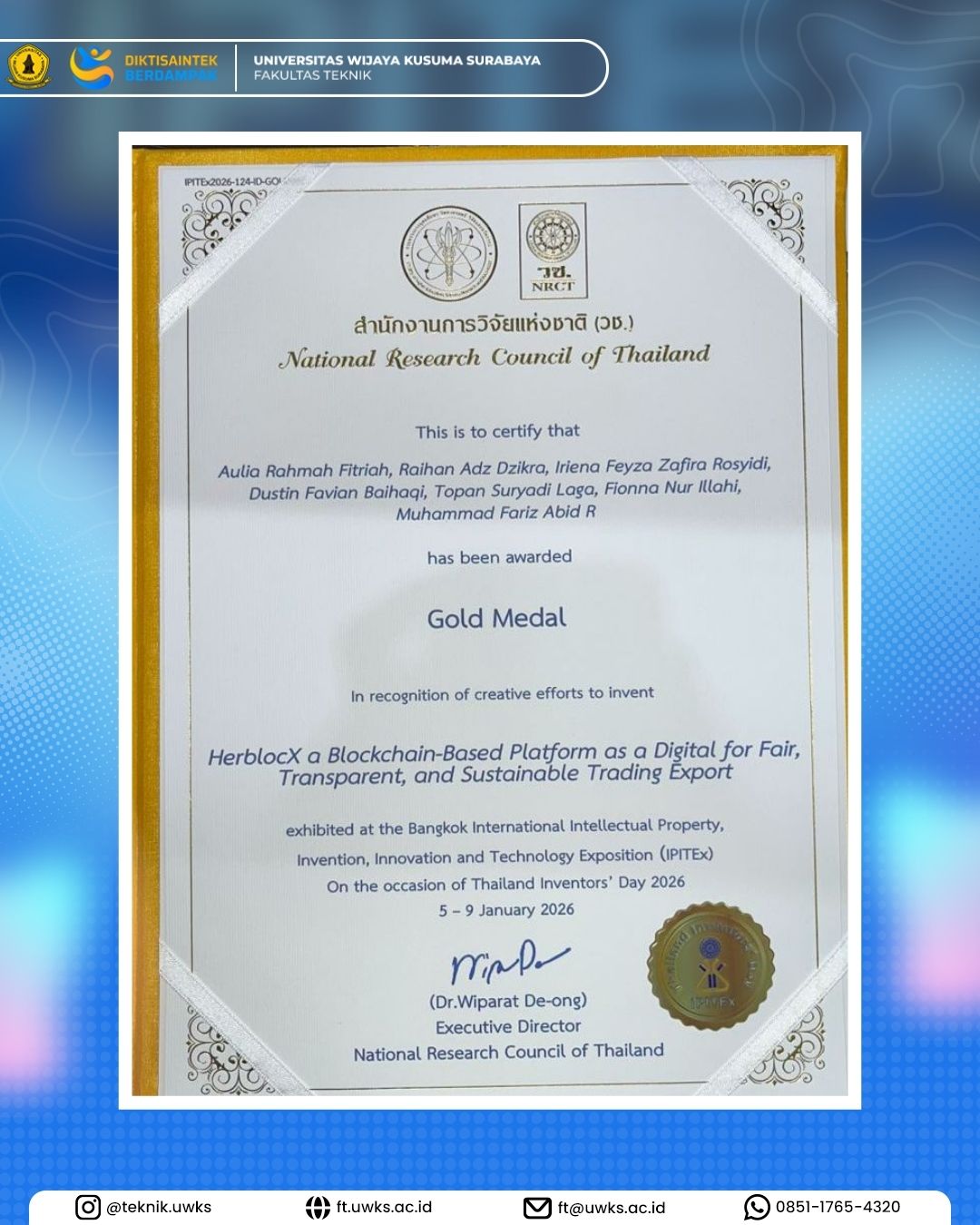 yang telah meraih Gold Medal pada ajang IPITEX 2026 (Bangkok International Intellectual Property, Invention, Innovation and Technology Exposition) yang diselenggarakan di Thailand ??????